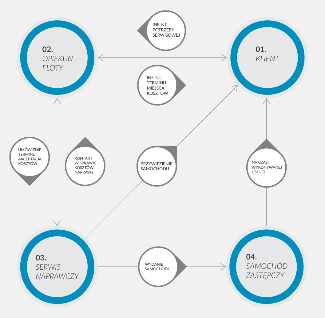 Informacja tel., mailowa lub osobista o potrzebie serwisowej od użytkownika lub flotowca do Działu Obsługi Posprzedażnej Flot – Opiekuna floty.